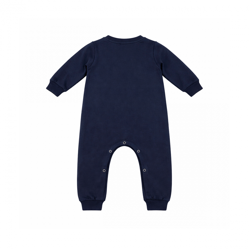 Pyjama : Matière coton, bleue et bande rouge avec texte sérigraphie blanche.